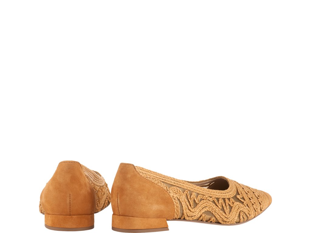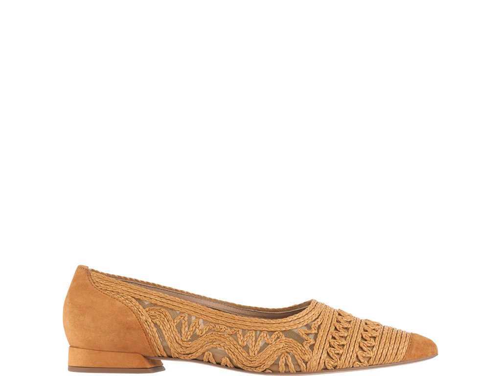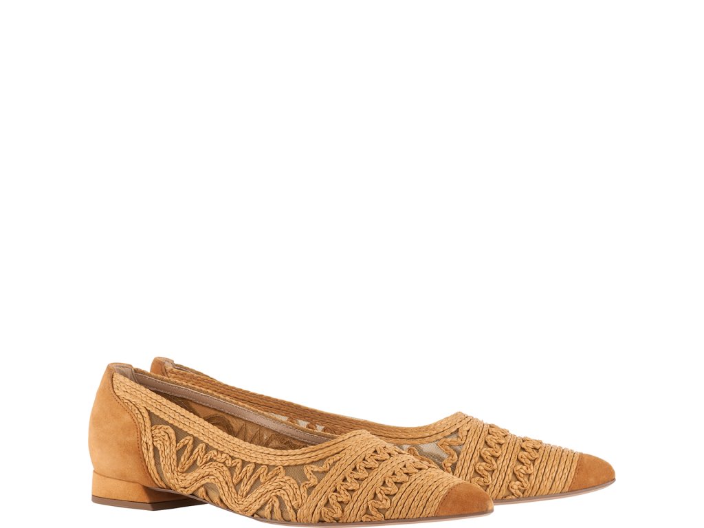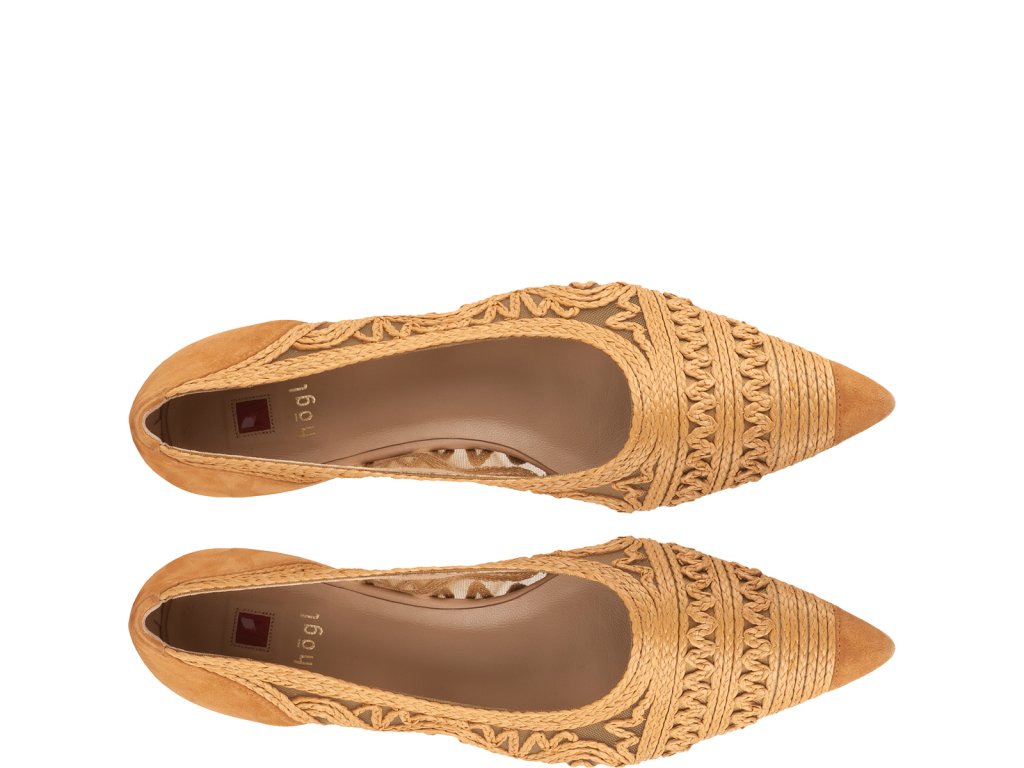 Dámské baleríny Högl na nízkém blokovém podpatku. Balerínky jsou špičaté, jsou vyrobeny z kombinace materiálů - hladká kůže, broušená kůže a textil - s macramé designem a copánkovým vzhledem. Výška blokového podpatku je 15 mm.