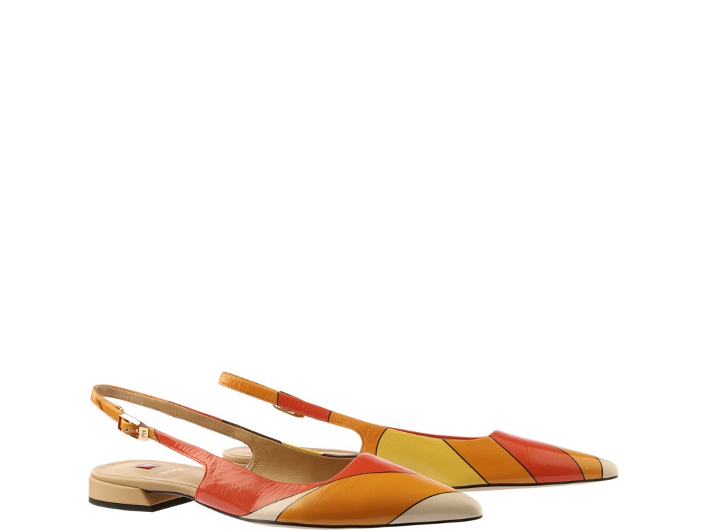 Dámské balerínky Högl s otevřenou patou. Obuv má špičatý tvar, je vyrobena z jemné hladké jehněčí kůže s vysoce leštěným povrchem, takže působí dojmem lakované obuvi. Má nízký blokový podpatek o výšce 10 mm.
