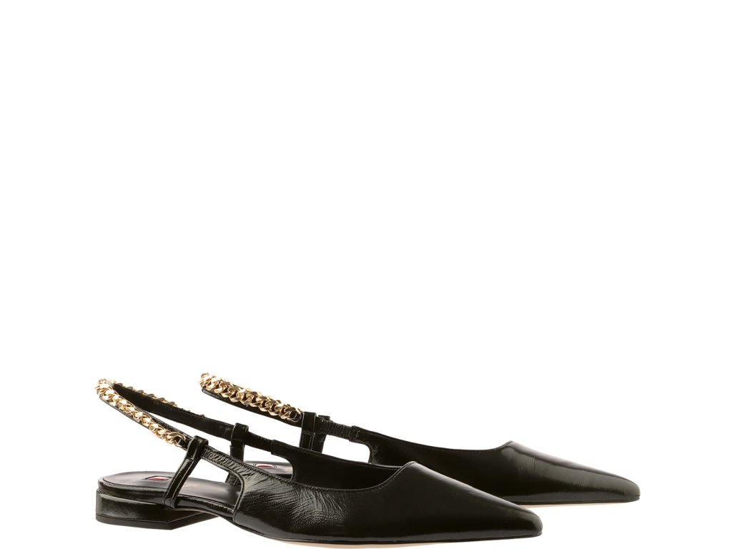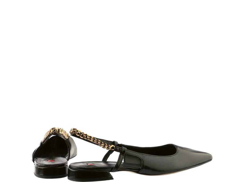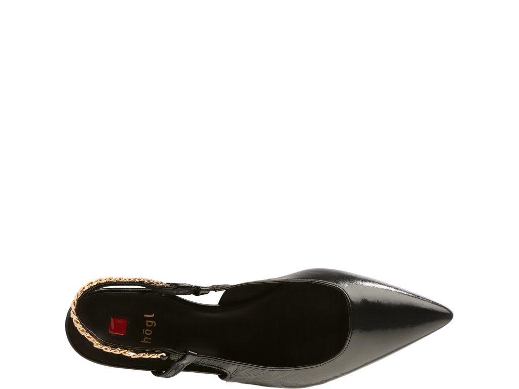 Dámské baleríny Högl s otevřenou patou. Obuv je vyrobena z jemné hladké jehněčí kůže a má lesklý, leštěný povrch. Balerínky mají nízký blokový podpatek o výšce 10 mm. Vzadu na řemínku u paty se nachází zlatý kovový řetízek, díky čemu působí velmi elegantně.