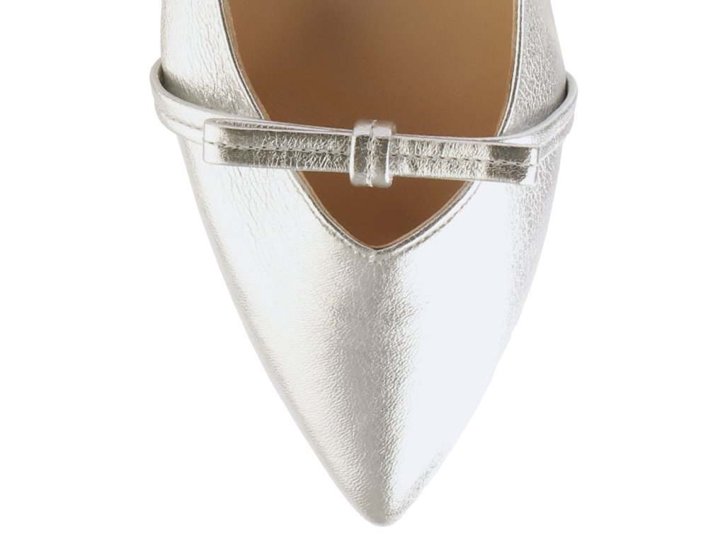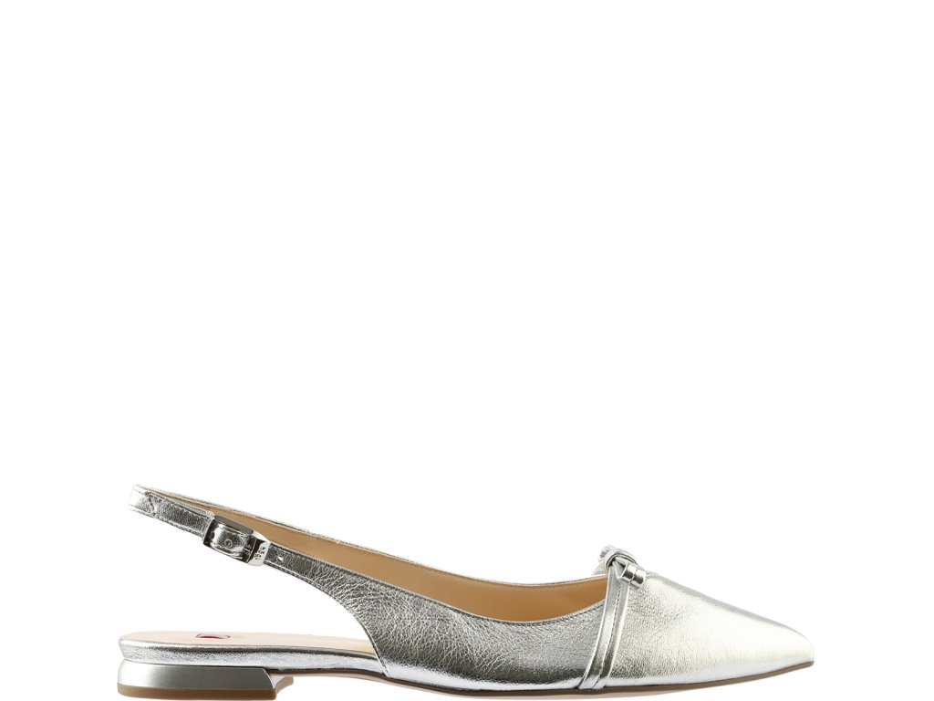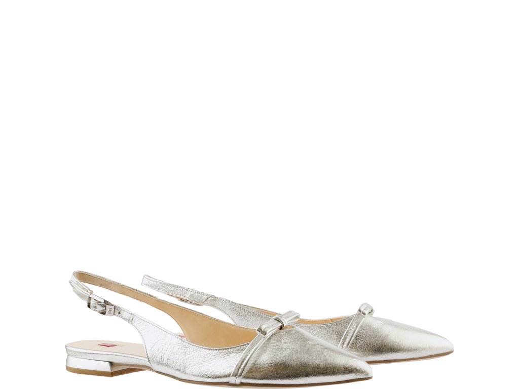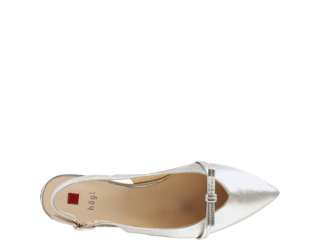 Balerínky Högl s otevřenou patou. Obuv je vyrobena z jemné hladké jehněčí kůže s metalickým povrchem, v přední části je ozdobena mašlí. Má nízký blokový podpatek o výšce 10 mm. Řemínek kolem paty je nastavitelný a s gumičkou, takže Vám balerínky budou vždy na noze perfektně držet.