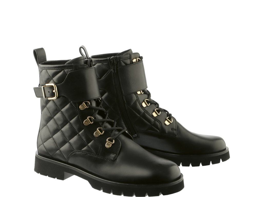 Dámská kotníčková obuv Högl z prošívané hladké černé kůže. Obuv má zlaté detaily-přezku přes holeň a detaily na šněrování. Na vnitřní straně obuvi je zip, který usnadňuje nazouvání a zouvání obuvi. Tyto kotníčkové boty mají blokový podpatek o výšce 35 mm.