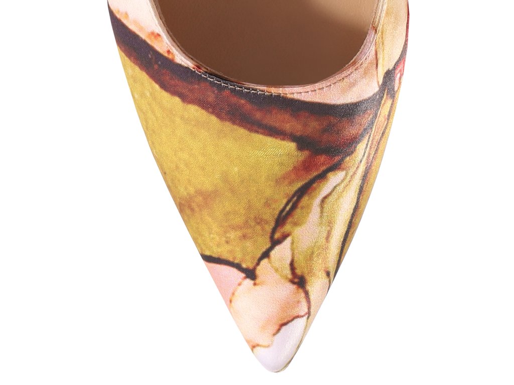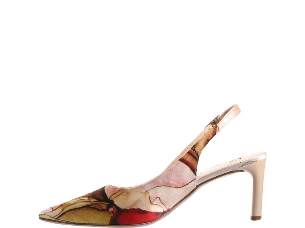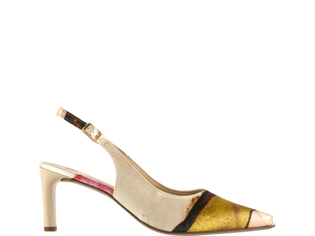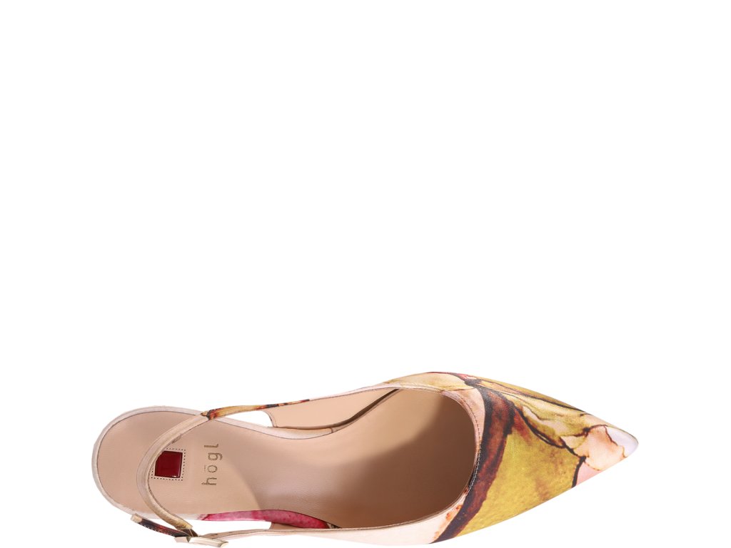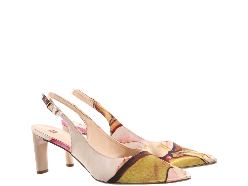 Dámské lodičky Högl s otevřenou patou na jehlovém podpatku. Obuv je vyrobena z jemné hladké jehněčí kůže, povrch je potažen saténovou vrstvou s abstraktním potiskem. Výška jehlového podpatku je 70 mm.