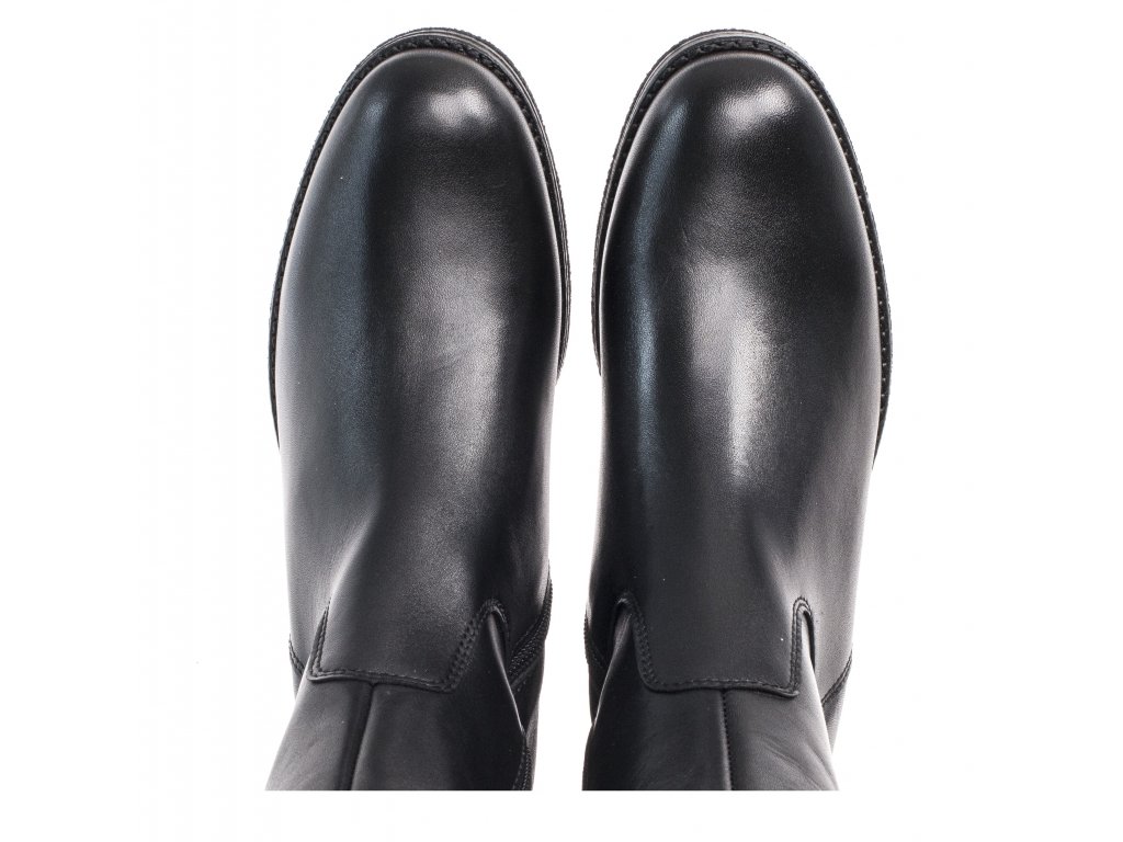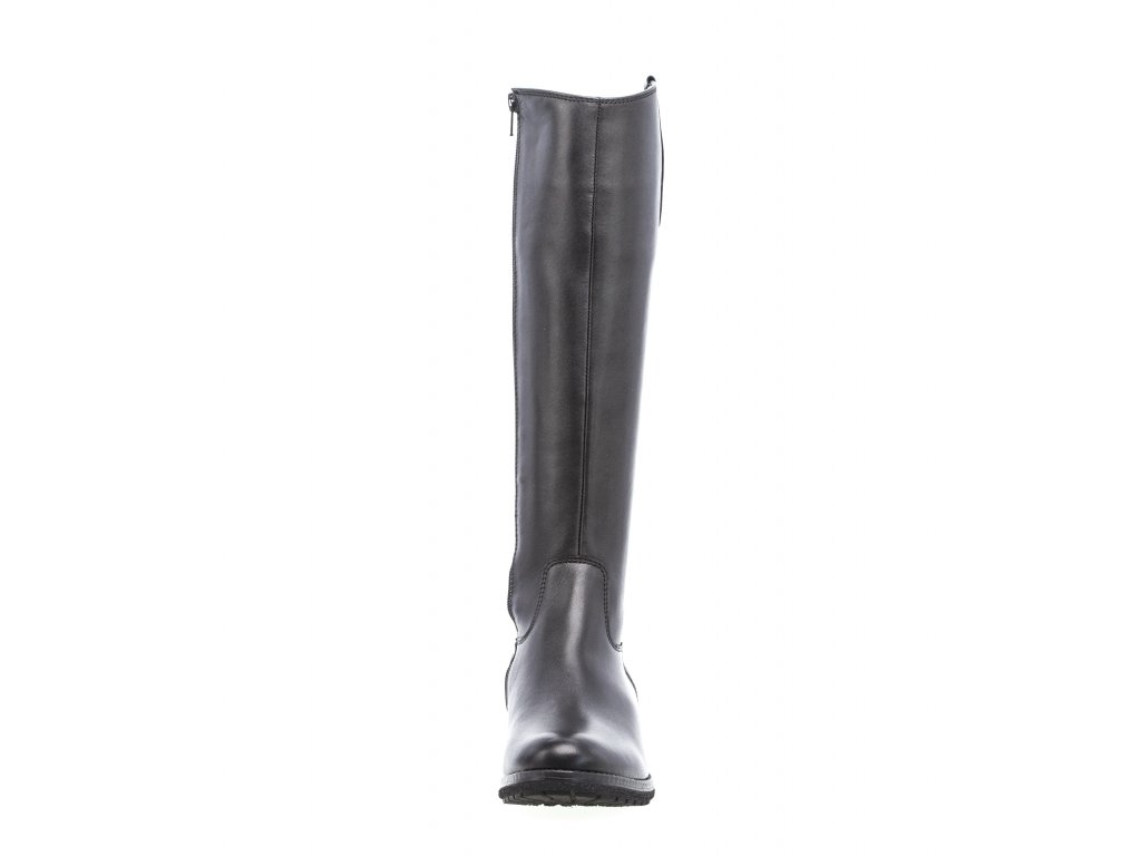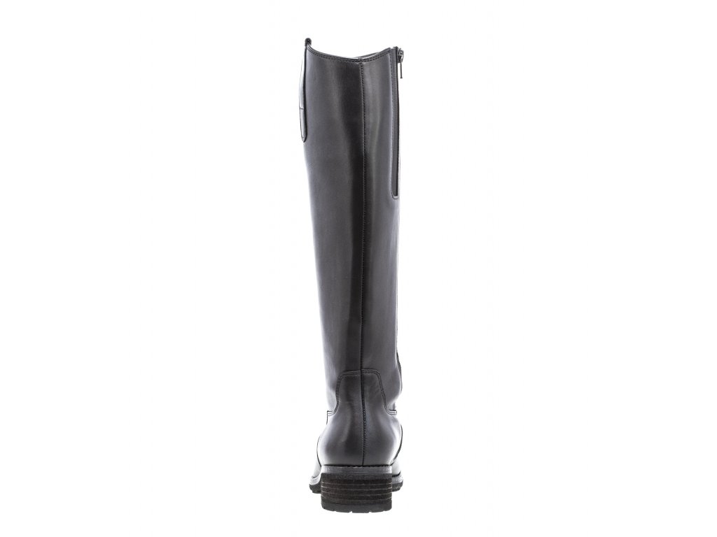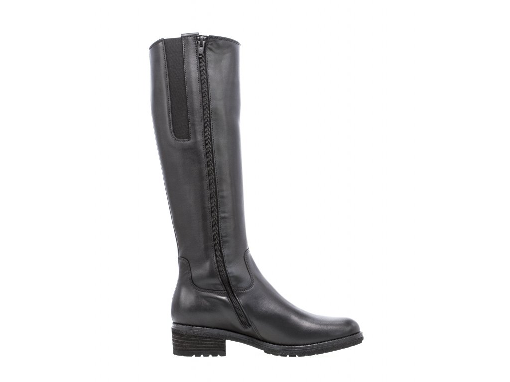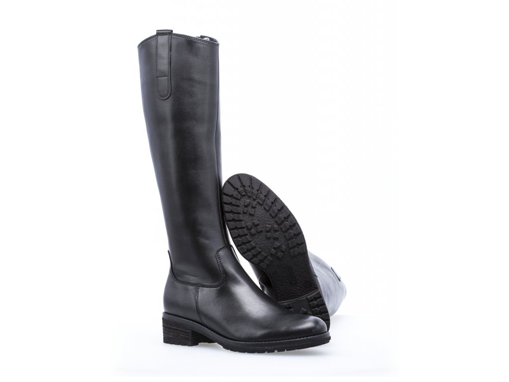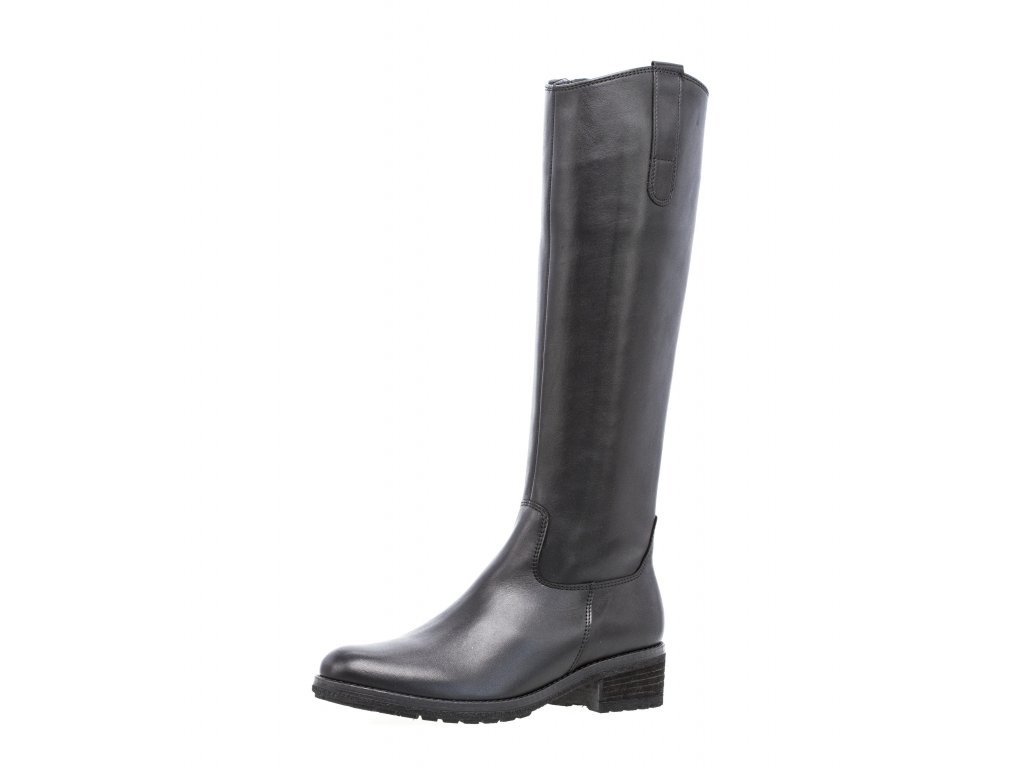 Dámské kozačky Gabor z hladké kůže v černé barvě. Hrubší, vzorovaná podrážka. Celková výška podpatku je 30 mm. Šířka obuvi: F, šířka lýtka: XS.