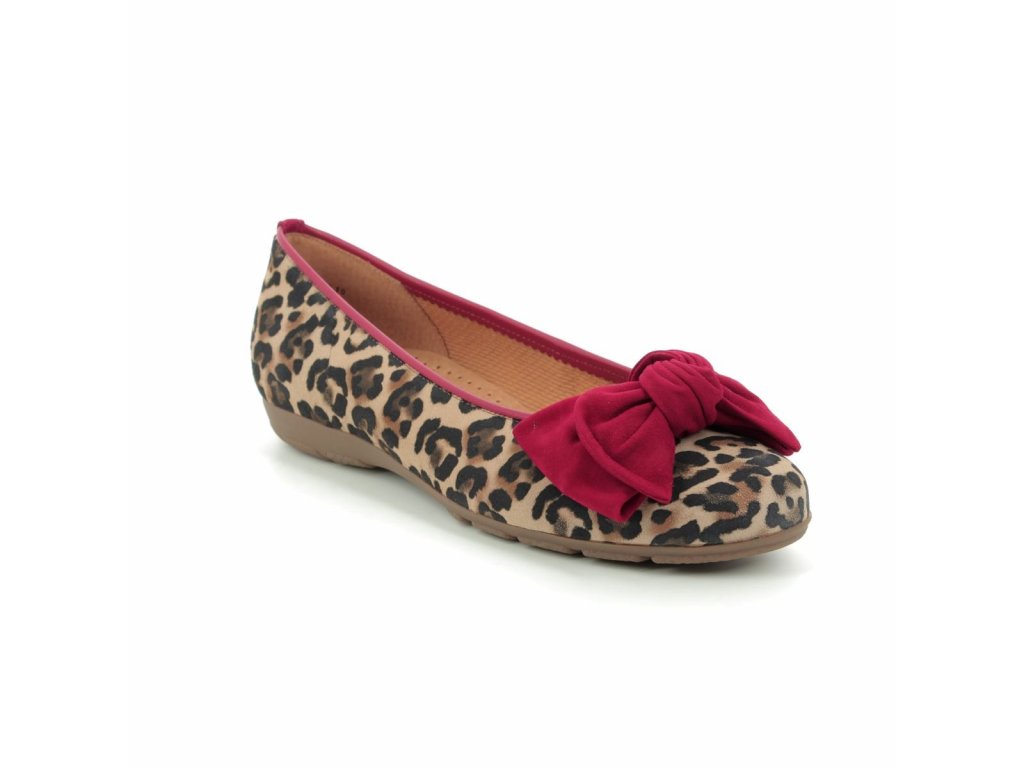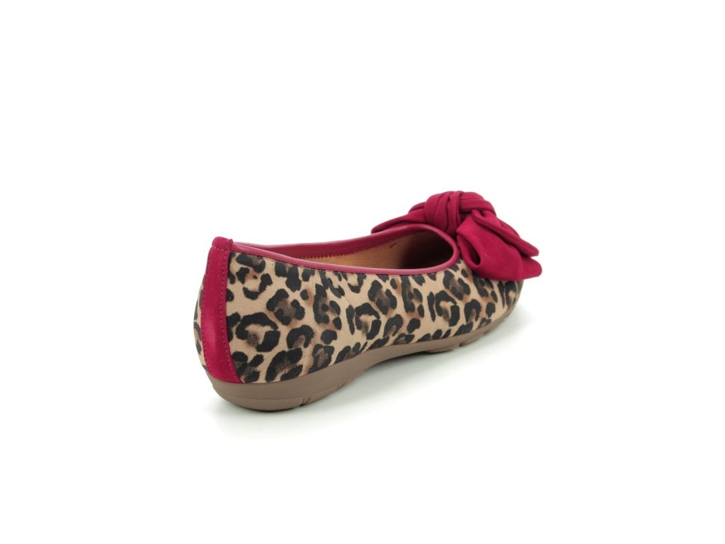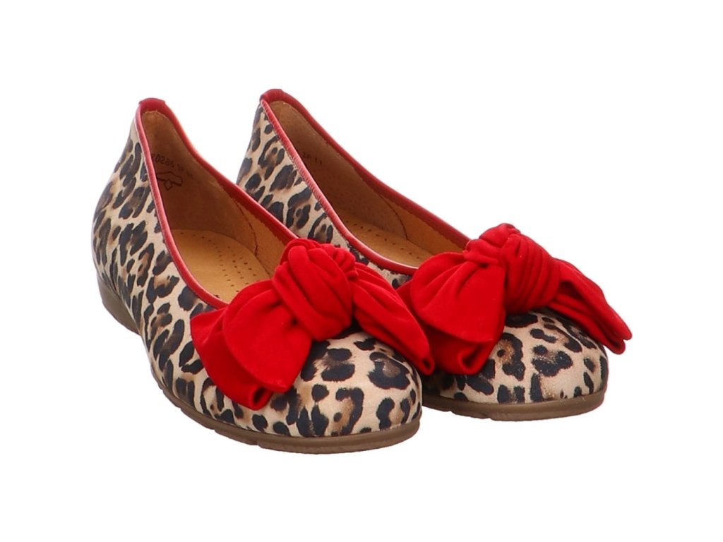 Dámské baleríny značky Gabor se zvířecím vzorem, na přední straně červená mašle.