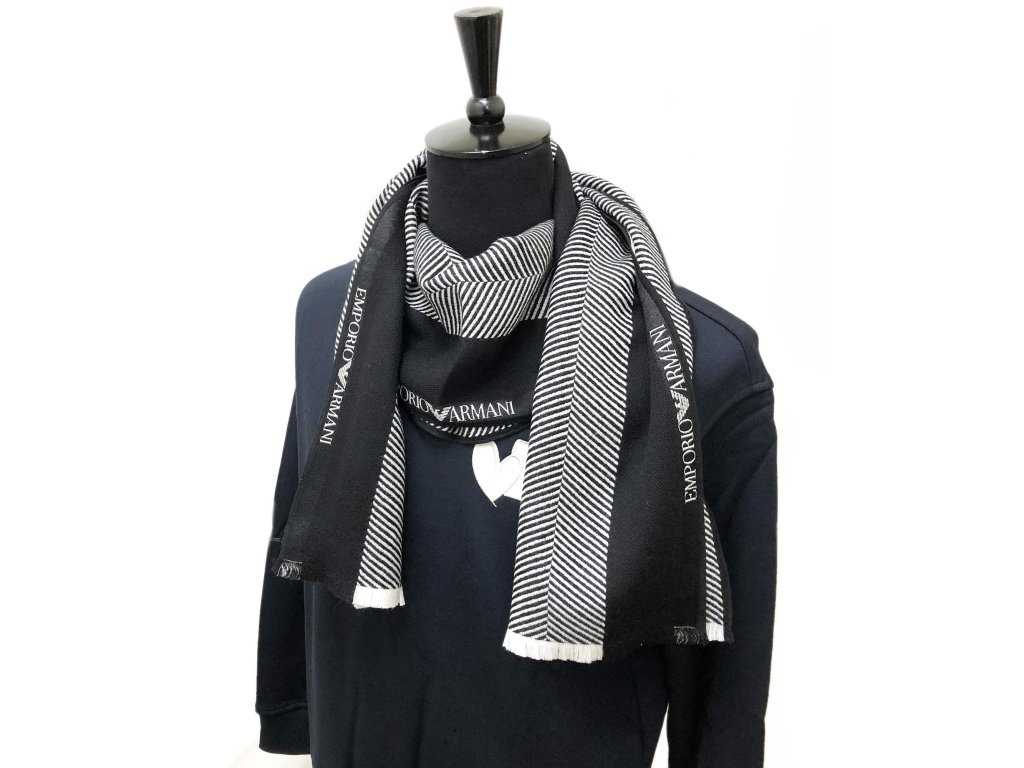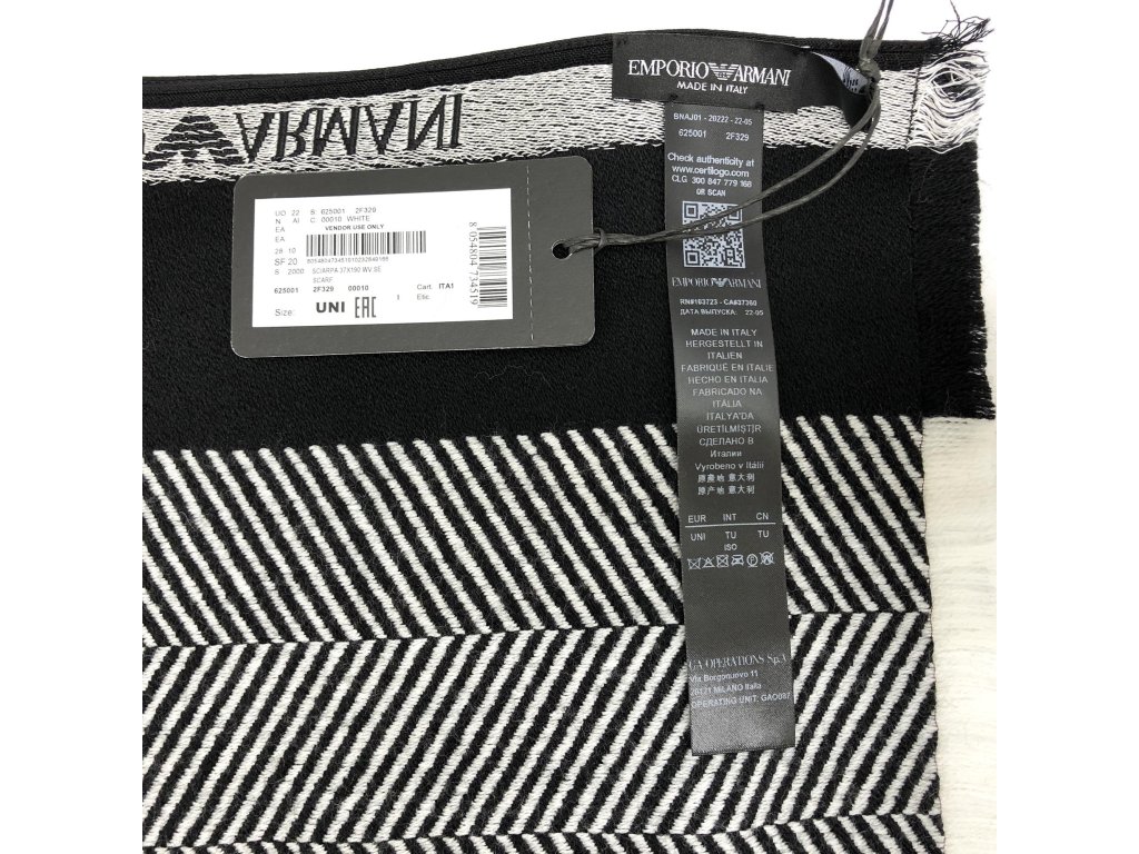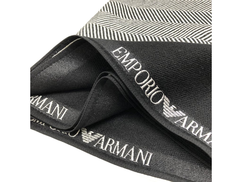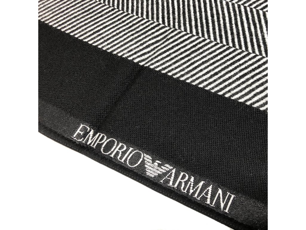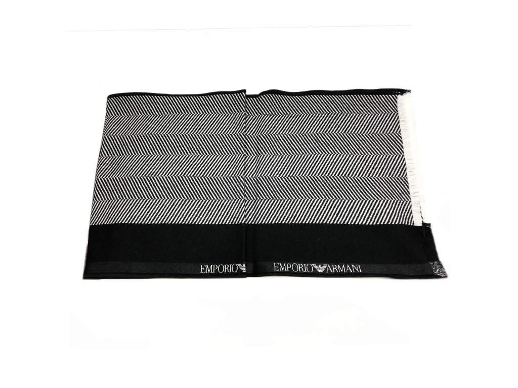 Pánská šála Emporio Armani s černo-bílým pruhováním. Materiálové složení: 95% vlna, 5% hedvábí. Rozměry: 190 x 37 cm.