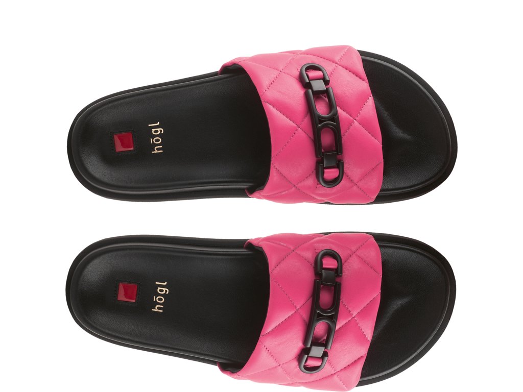 Dámské pantofle Högl na nízké platformě. Obuv je vyrobena z jemné hladké jehněčí kůže, v přední části se nachází dekorace v podobě spony černé barvy. Výška platformy je 10 mm. Pantofle jsou díky pěnové platformě a tvarované měkké stélce mimořádně pohodlné. Tento kousek by Vám v botníku neměl chybět!