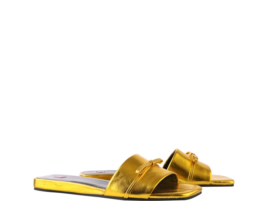 Dámské pantofle Högl z hladké jehněčí kůže s metalickým povrchem. Obuv má protiskluzovou gumovou podrážku s lehce zvednutou patou (10mm). Malá mašle jim dodává elegantnost a šarm.