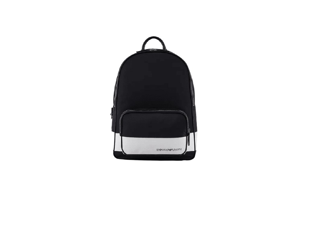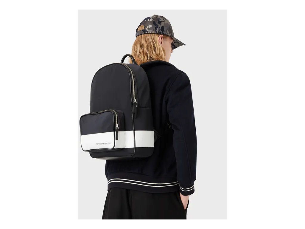 Pánský batoh Emporio Armani v modro-bílém provedení. Bílý pruh oživuje celkový vzhled batohu a dodává mu sportovní nádech. Svrchní část je vyrobena z polyesteru. Rozměry: 45 x 32 x 11 cm.